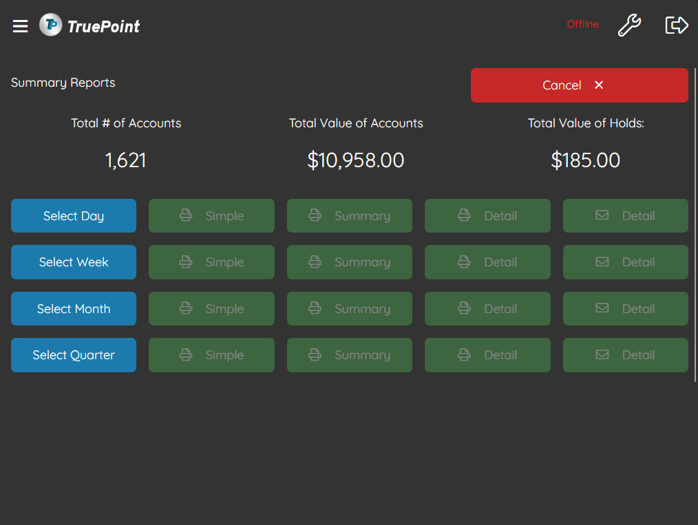 - A Simple report only shows the total cash in, total cash out, Total on Hold and Total on Accounts (as of time of print or email).