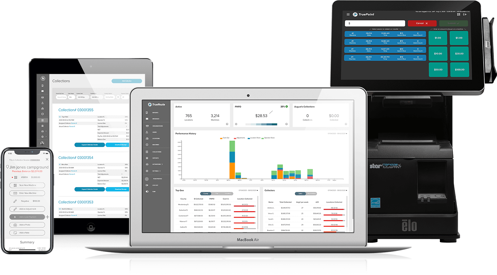 The TruePoint POS is designed to be a drop-in replacement for the MuthaGoose platform, and to easily connect and track activity across all the devices in a location. TruePoint uses the same pulse-based adapters (Fledgling, etc), for easy, direct connection to existing machines.